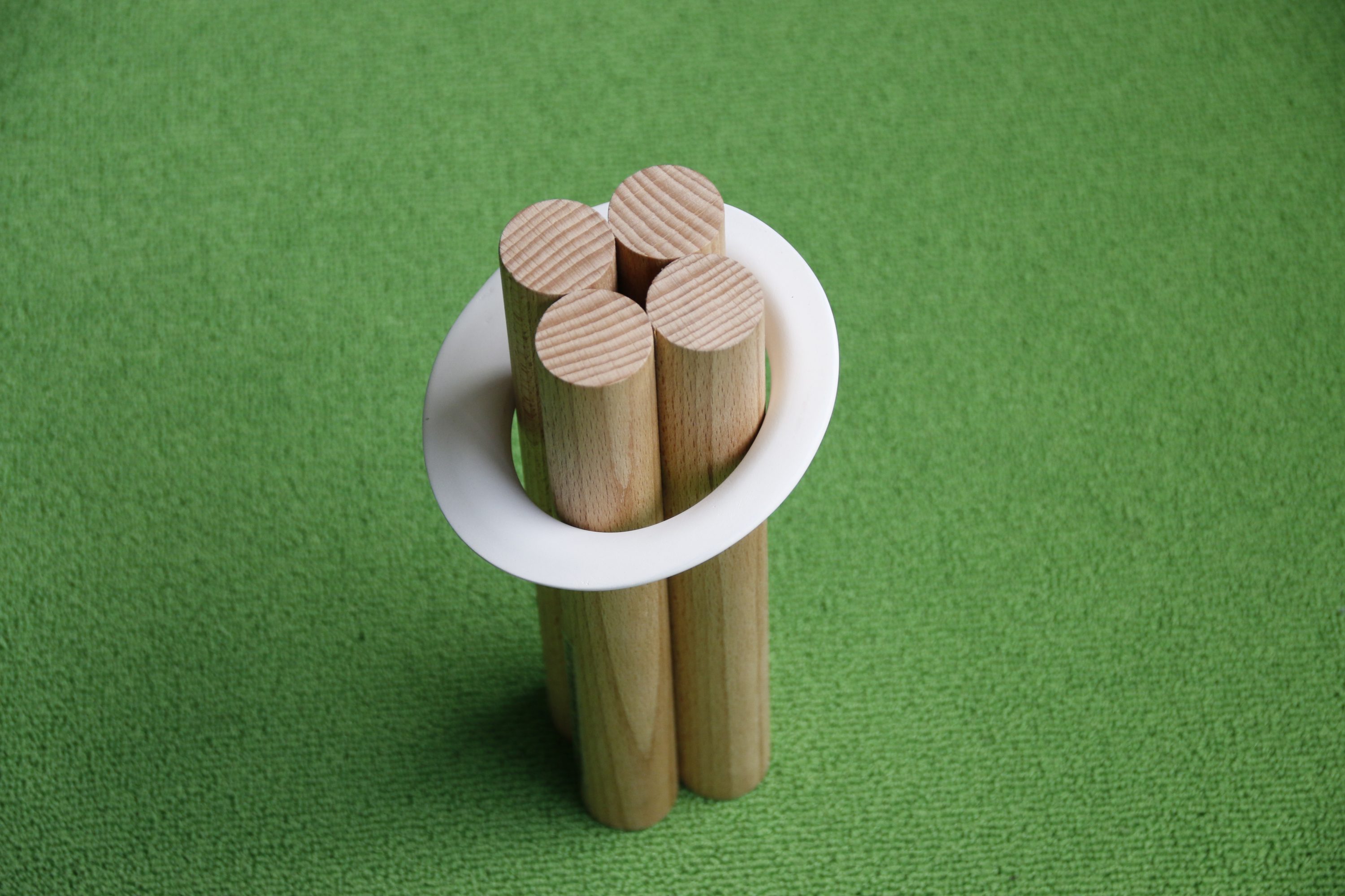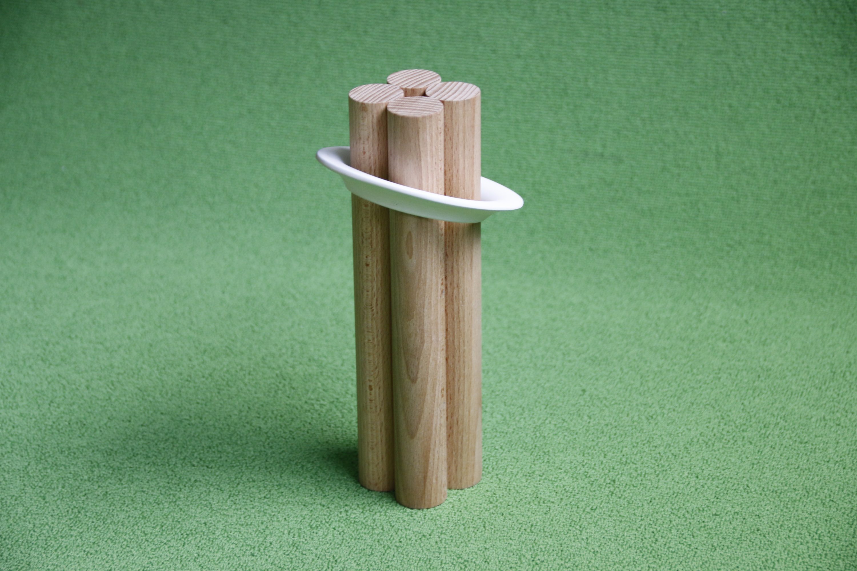 La pieza es una sutil combinación de elementos geométricos torneados en madera de haya y porcelana. Además de su sencillez y rotundidez formal, está concebida para responder con comodidad al gesto de las manos que entregan y reciben.